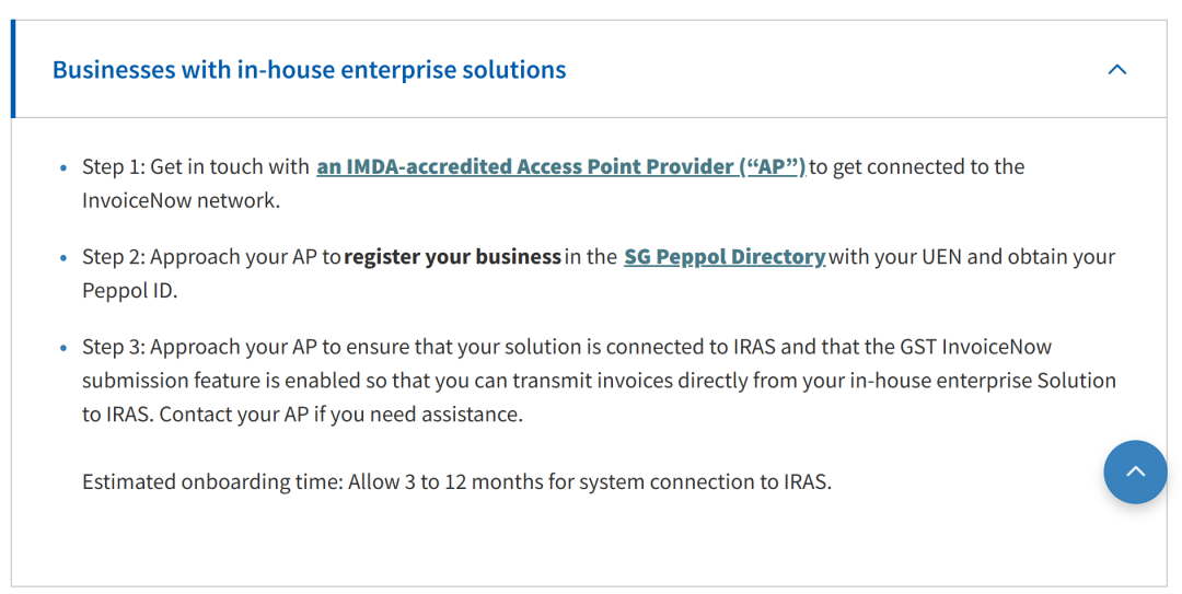 大型企业若使用自研系统,需与 IMDA 认证接入点合作完成网络对接。