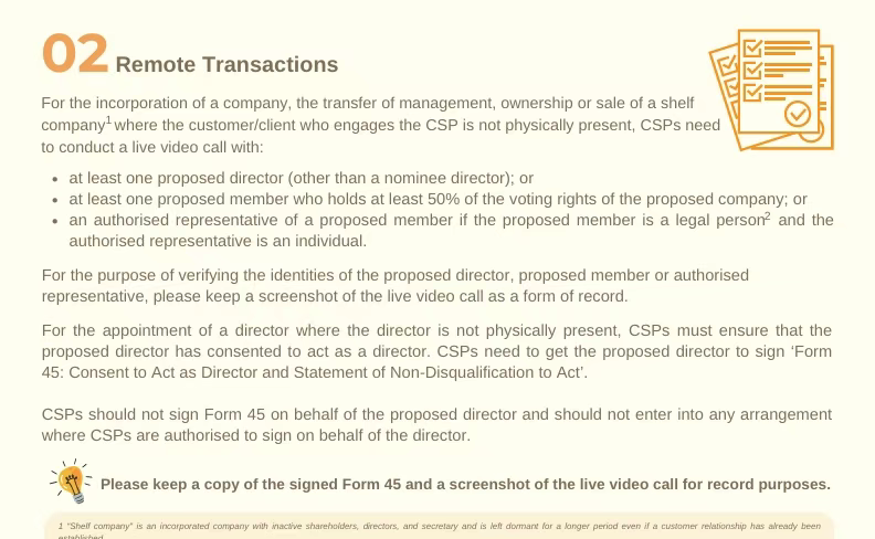 今后,对于公司注册、管理层转移、所有权转让或空壳公司的出售等所有关键操作,如果客户/委托人没有亲自参与,CSP需要与上述相关人员进行实时视频通话,来核验确认身份,确保“本人知情、本人同意”。