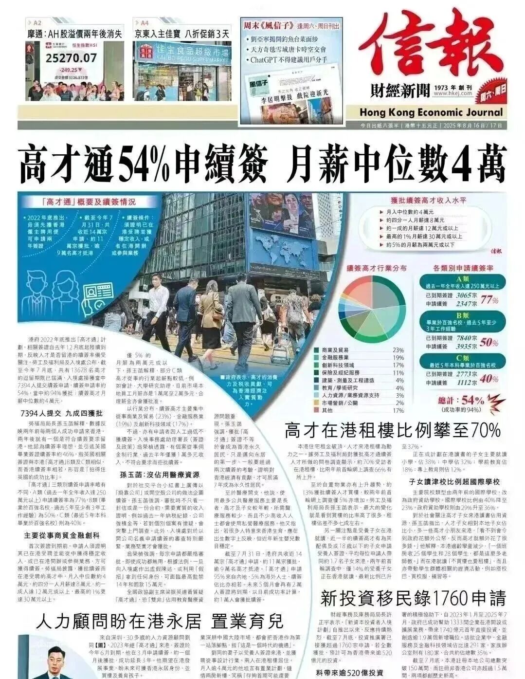 经济与就业拉动:获批高才中,三分之一是年收入超250万港币的高管/企业家,他们赴港极可能创业,催生新行业,创造就业。另外三分之二为世界名校毕业的年轻精英(多为40岁以下),有效缓解了香港人口高龄化和劳动人口下滑趋势(2019-2022年连续4年下滑被成功扭转)。2023年劳动力增加4万人至350万,35-44岁群体贡献一半增长。