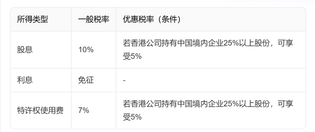 香港回内地的预提税也是非常低的,利息免征预提税,股息可享最低5%的预提税。