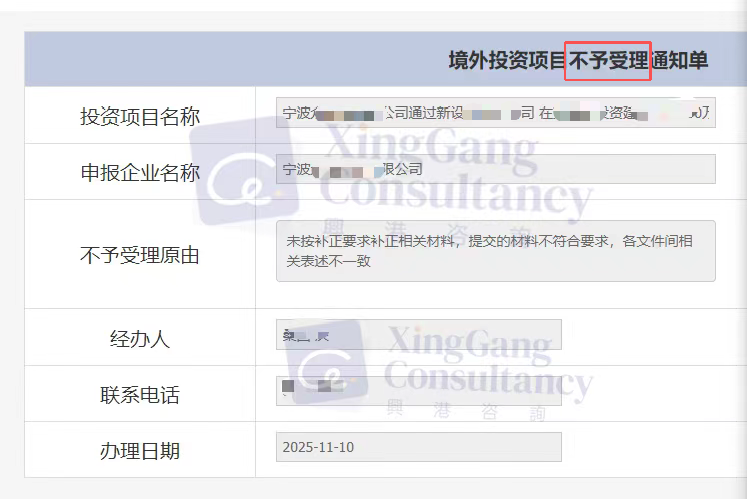 就在我们为客户的成功欢呼时,另一家自行尝试ODI备案的企业,却收到了主管部门下发的《不予受理通知书》。官方明确列出了三条驳回理由,条条直指DIY申请的典型软肋: