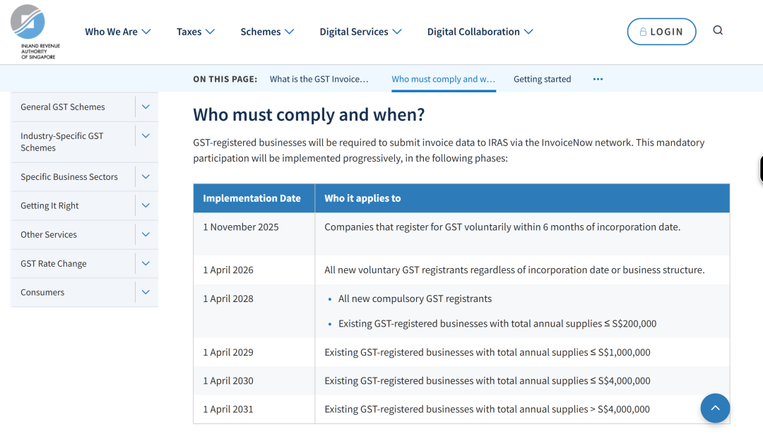 3.技术指导:IRAS 发布《GST InvoiceNow 实施指南》,IMDA 提供系统对接技术规范与测试环境。