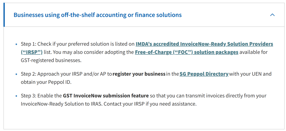 企业必须使用通过IMDA认证的InvoiceNow-Ready解决方案(会计或财务软件),通过接入点(Access Point)与IRAS连接,传输发票数据。