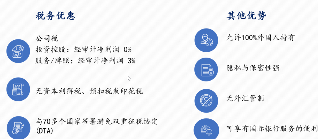 1.公司税:投资控股等非贸易活动的公司税为经审计净利润的0%税率。服务/牌照类的公司税为经审计净利润的3%税率。