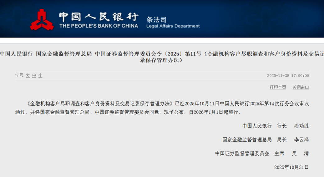 2025年11月28日,中国人民银行、国家金融监督管理总局和中国证券监督管理委员会联合发布了 《金融机构客户尽职调查和客户身份资料及交易记录保存管理办法》 ,该文件以央行〔2025〕第11号令形式公布。